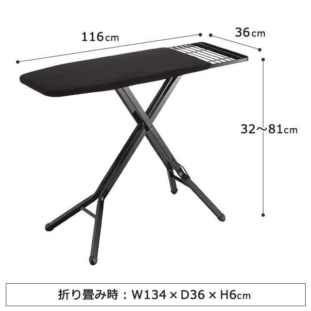 サイズ 使用時:約 幅 116cm × 奥行 36cm × 高さ 32〜81cm 収納時:約 幅 134cm × 奥行 36cm × 高さ 6cm 重量 7kg 素材 表面布:(ホワイト)麻・綿、(ブラック)綿100% クッション材:ポリエステル 本体:スチール(粉体塗装) ボタンプレスゾーン(凹凸吸収クッション):ポリウレタンフォーム キャップ:ポリエチレン スタイリッシュ で おしゃれ な ホワイト ブラック スチール の アイロン台 アイロンスタンド tower TOWER タワー スタンド式アイロン台 は 15段階 に 高さ調節 可能 な 折り畳み式 アイロンボード です。